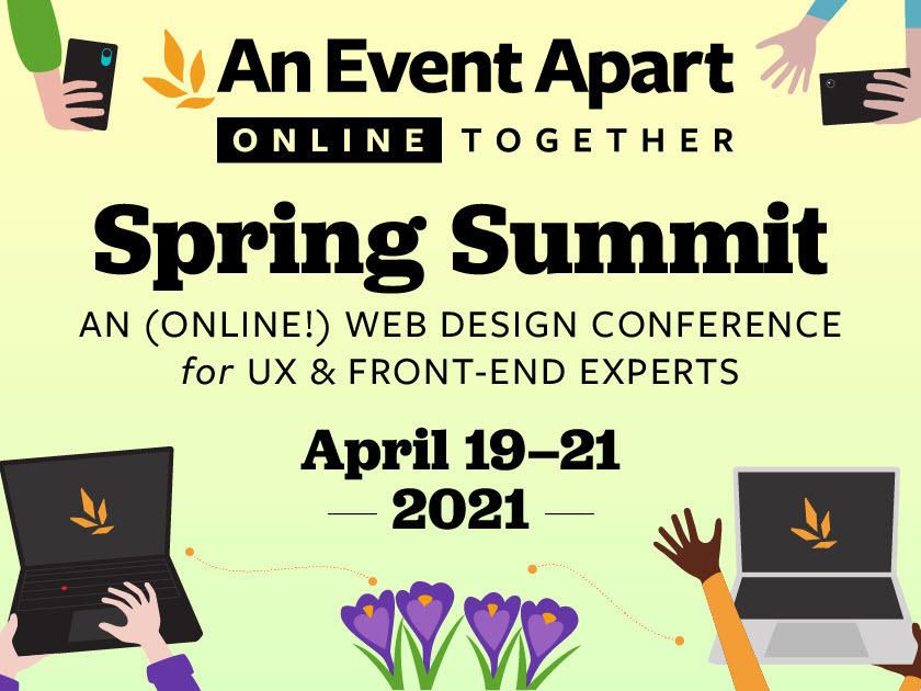 Spanning the spectrum from advanced CSS to inclusive and cross-cultural design, to web components and PWAs to user research, An Event Apart Online Together: Spring Summit features fifteen important sessions from world-class experts to keep you up-to-date with today’s best practices. Join us online April 19–21.